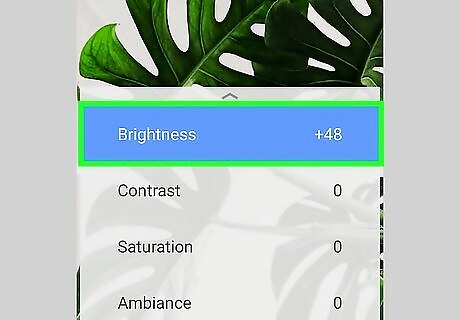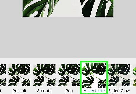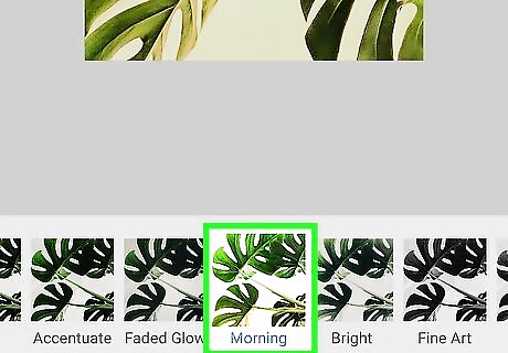 Choose a filter. Every app is different, but many of them, like Instagram, have a variety of "filters" or "lenses" to choose from, which essentially do all of the editing for you. Look for tabs or icons at the bottom or top of the photo preview to see what adjustments you can make with the app you are using. Most photo editing apps display filters as tiny thumbnail previews at the bottom of the screen. Tap a thumbnail image to see a preview of how it will affect your image. Look for slider bars or an icon with slider bars that you can use to adjust the intensity of the filter.