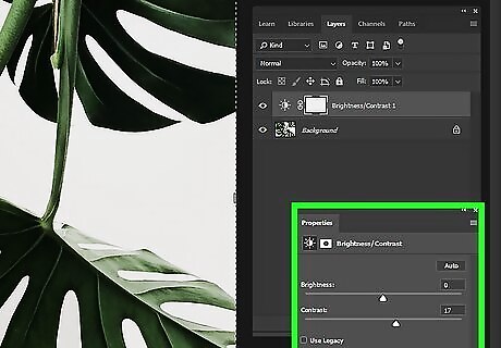 Change the contrast. This is a common setting for any photo editor. It makes whites brighter and darks darker, making an image look more dramatic and clearer. Be careful, however: you lose a lot of minor details when you increase contrast. To adjust the contrast in Photoshop, click the icon that resembles a sun that is half white and half black above the Layers panel to the right. This adds a brightness and contrast adjustment layer to the photo. Click the layer in the layers panel and use the brightness and contrast slider bars above the Layers panel to adjust the brightness and contrast. To adjust the contrast in GIMP, click Brightness and Contrast in the Colors menu at the top. Then use the slider bars to adjust the brightness and contrast. Then click Ok.