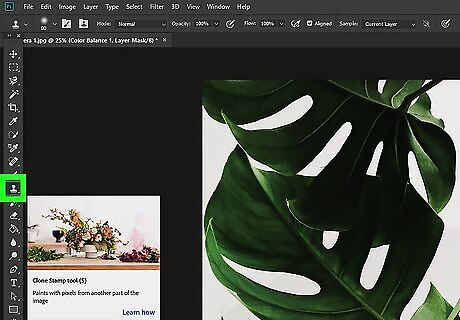 Use the Clone Stamp and Healing tools. The Clone Stamp and Healing tools are a good way to remove small blemishes and imperfections within an image. The Healing tool has an icon that resembles a bandaid in both Photoshop and GIMP. The Clone Stamp tool has an icon that resembles a stamp in both Photoshop and GIMP. To use the Healing tool, click the healing tool and then select a brush and brush size using a menu above or below the toolbar. Click the spot you want to heal. The Healing tool will blend over it using colors and patterns that surround the spot. To use the Clone Stamp tool, click the Clone Stamp tool and pick a brush and brush size from the menu bar above or below the toolbar. In Photoshop, hold "Alt" ("Command" on Mac) or "Ctrl" ("Control" on Mac) in GIMP and click a spot of the image to sample from the image. Click another part of the image to stamp your sample in another location.