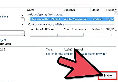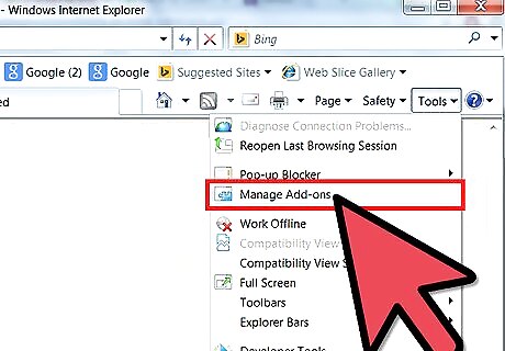 Click “Manage Add-ons.” This should open a menu that will let you choose which toolbars and Add-ons you want to enable.