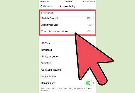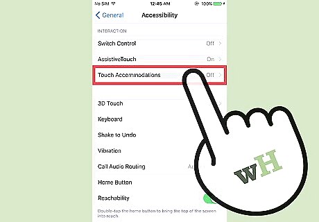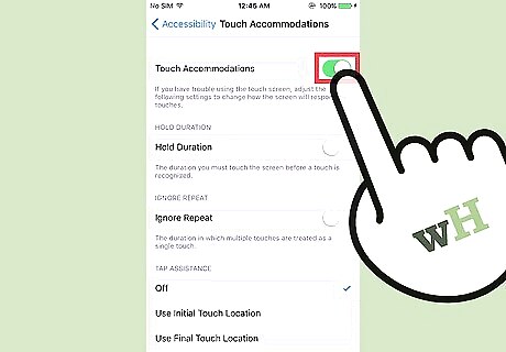 Slide the Touch Accommodations switch right to the "On" position. Doing so will turn on Touch Accommodations. From here, you can modify the following items: Hold Duration - Alters the amount of time your finger has to be on the screen before your phone recognizes it as a tap. Ignore Repeat - Alters the amount of time in which several touches are counted as one. Tap Assistance - Alters the properties of Tap Assistance--a feature that counts an entire finger drag as a single tap.