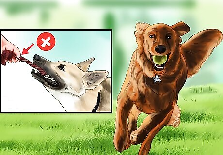 Modify the games you play with your dog. A senior dog, although interested in playing, will not be able to play with the same intensity that it did when it was younger. In order to continue to play with your dog as they age, you should modify the games so that they are suitable to an older, less mobile dog. You can also allow your dog to continue to play with some of their favourite toys, but in a modified way. For example, if your dog enjoys to play tug-of-war you can still play this game. Instead of tugging the toy, just hold onto it as your dog pulls at it. You may want to let the dog win more easily than you did when it was younger. Alternatively, if your dog likes to play fetch, try throwing the ball a shorter distance and only throw it five times instead of twenty. Regardless of the activity, always monitor your dog’s energy level. If they begin to slow down and pant excessively while playing, it is probably a good idea to take a break.