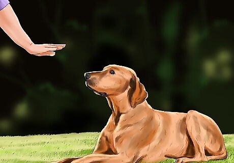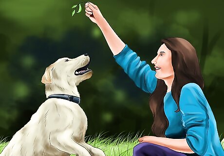 Teach your dog hand signal commands. As your dog ages, it may lose its hearing and be unable to follow simple commands, such as sit and stay. One way to stimulate your senior dog is by spending time teaching them hand signal commands. Dogs thoroughly enjoy spending quality time with their human and training can actually feel like a game to many dogs. Use food-based rewards to teach your dog hand signals. For example, teach your dog to sit using a hand signal. Simply place a treat in your hand, stretch your arm out in front of you (palm facing up) and then move your arm downwards to the side of your leg. At first you may need to give the signal and physically adjust your dog into a sitting position. Once sitting, give the dog a treat. Repeat this until the dog learns the signal command and no longer needs to be adjusted. You can teach other hand signals either by following standard dog obedience commands or by following American Sign Language commands.