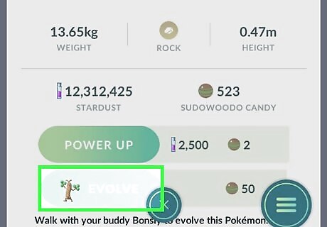 Tap the EVOLVE button. You can find this button below the green POWER UP option. It will consume 50 Sudowoodo candies and evolve your Bonsly to Sudowoodo.