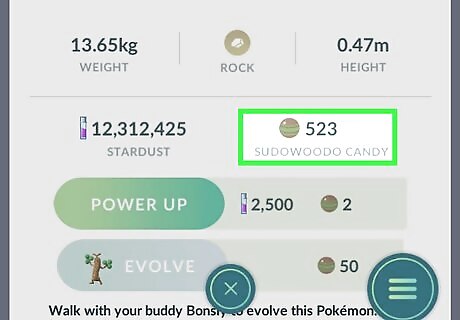 Check if you have enough Sudowoodo candy. The number of Sudowoodo candies you have is listed below the weight and height information on the information card. You will need 50 candy to evolve Bonsly. If you don't have enough Sudowoodo candy, go ahead and collect more by catching more Sudowoodo. Each new Sudowoodo catch will give you 3 to 5 Sudowoodo candies. If you have duplicate Sudowoodos or Bonslys, you can transfer the duplicates to Professor Willow for 1 candy each.