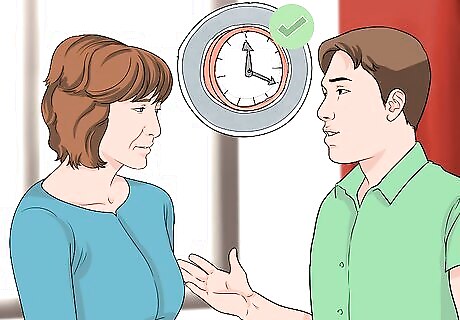 Find a good time to talk. If you want to let your parents know how much you care, find a good time to do so. Parents are busy, and will appreciate you not bothering them when they're busy. Think about when your parent is usually free. For example, if your mom is usually busy on Wednesday nights, don't talk then. Wait until she has some downtime on a Thursday. Pick a time when your parent is usually not distracted as well. While your dad may be home most Fridays, maybe he likes to watch a particular show that night. He may not pay as close attention to conversation.