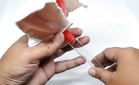 Slowly squeeze out the strawberry slurry from the plastic bag onto the cheesecloth covering the funnel. Be sure not to rush, or else the slurry could spill everywhere and make a big mess. This process may take some time, but there should be strawberry-colored liquid dripping into your beaker/test tube filtered through the cheesecloth. Continue until all of your strawberry slurry is squeezed out of the plastic bag.