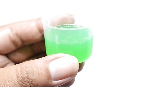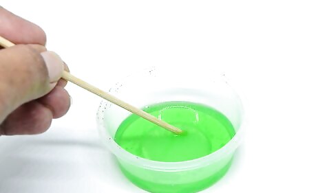 Mix three pinches of salt with 15 milliliters (0.51 fl oz) liquid dish soap in the small cup. Stir until salt is dissolved with a skewer. Set aside for later.