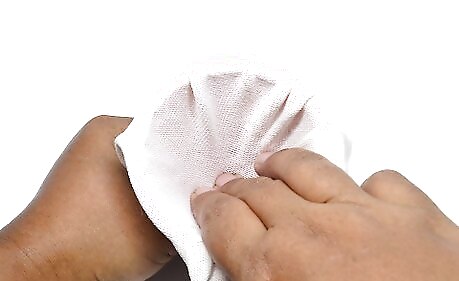 Stuff the cheesecloth into the funnel. Do this until the funnel is completely covered with cheesecloth. Keep in mind that the cheesecloth should be large enough for the corners to stick out of the funnel's rim. Hold the sticking-out corners so that the cheesecloth can't slide down into the funnel's tube. Another option is to simply hold the cheesecloth onto the funnel as you would hold a cup. Make sure your thumb and index finger form a circle.