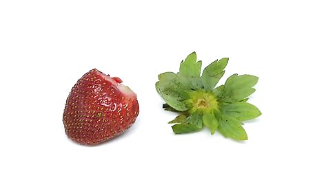 Remove the green section from the strawberry. Try to seize the leaves in one fist, then tug the entire crown of leaves out. If pulling doesn't work, cut the section out with a small kitchen knife.