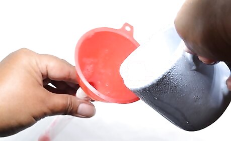 Pour ten mL of your dish soap-salt mixture into the graduated cylinder. View the liquid at eye level as your pour. That way, you can make sure you have measured out the correct amount.