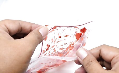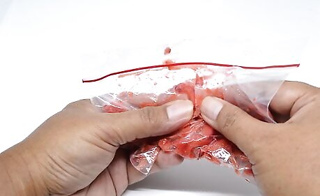 Push out all the extra air in the bag and reseal. Smush with your fingers again for about one minute. Do this in order to mix the liquid solution with the strawberry mush.