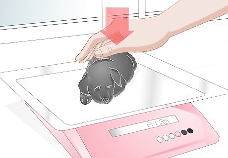 Weigh the puppy. In order to assess whether your puppy is getting enough food, you should weigh it before every feeding. In general, it should be gaining ten percent of its body weight every day. This repeated weighing also helps you to gauge whether you are feeding the puppy the right amount of food. The amount of milk replacement you feed your puppy depends on its weight. If it is quickly gaining weight then you will need to adjust the amount you are feeding it. Consult the directions on the packaging for specific amounts.