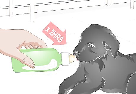 Feed a newborn puppy every two hours. Very young puppies need to eat many times each day. This can be a lot of work, especially if the puppy is very, very young. However, it is essential to the proper development of the puppy. A newborn puppy needs to be fed twelve times a day. This means every two hours, even at night. A puppy that is one week old should be fed eight to ten times a day. A four week old puppy should be fed four times a day.
