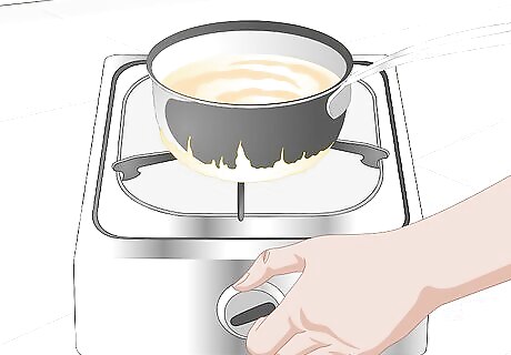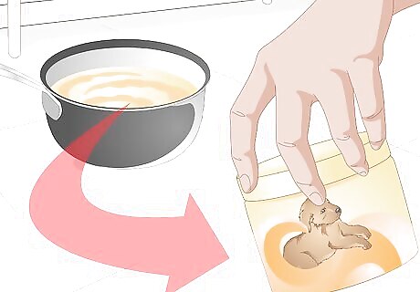Warm the milk. Puppies that have just been born may need the milk they drink warmed a bit. Just as with commercial milk replacement, this emergency milk replacement should be warmed to 95 to 100 degrees. This will help to encourage that the puppy drinks it. Be careful to heat it slowly and do not overheat it. The yolks will cook if it is heated to quickly or heated too much. If you warm the milk in the microwave, do it in short increments (5-10 seconds) and stir it several times while heating. This will reduce the risk of hot spots. Be sure to test the temperature of the milk before giving it to the puppy. Very hot milk could seriously injure a newborn puppy.
