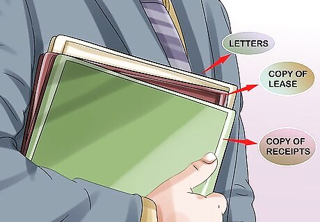 Gather documents related to your tenancy. At a minimum, you'll need all the documents filed with the court, a copy of your lease, and copies of any receipts, letters, or other communication between you and your landlord. If you're arguing that your unit was unsafe or unsanitary, you can also make photos that show the conditions of the unit or damage to the exterior of the building. You may also want to get copies of any inspections that were performed, either by government inspectors or by your landlord.