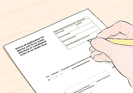 Complete your application for a Decree Nisi. If your spouse agrees to the divorce, you can apply for a Decree Nisi. This document basically says that the judge doesn't see any reason why the two of you can't get divorced. You must wait until you get a response to the petition from your spouse before you apply for the Decree Nisi. Download the application at https://www.gov.uk/government/publications/form-d84-application-for-a-decree-nisi-conditional-order-or-judicial-separation-decreeorder.Tip: Even if your spouse didn't agree to the divorce, you can still apply for a Decree Nisi. However, you'll have to go to a court hearing so the judge can hear from both of you and decide whether to grant the order.