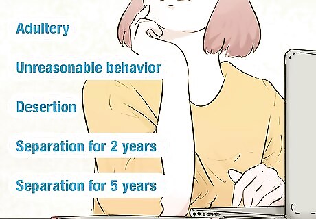 Find a suitable grounds for divorce. To get a divorce in the UK, you must prove that you and your spouse have no way of working through your problems. The UK recognizes 5 distinct reasons, known as "facts" or "grounds" for divorce: Adultery, if one of the spouses cheated on the other; Unreasonable behavior, including domestic abuse or commission of a crime; Desertion, if your spouse left more than 2 years ago with the intention of ending the relationship; Separation for 2 years, meaning that the two of you have lived separate lives during that time and no longer share anything, including property or bills, and you both agree to the divorce; or Separation for 5 years, if one of you doesn't agree to the divorce.
