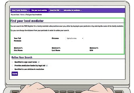 Attend mediation to divide property if necessary. Your divorce merely ends your marriage. It doesn't divide your property and assets or provide for any children of the marriage. If you and your spouse can't come to an agreement on these matters on your own, you can use a mediator to reach a fair agreement. To find a mediator near you, go to https://www.familymediationcouncil.org.uk/find-local-mediator/. Mediation is required before you can get a court order dividing your property. If you're on low income or receiving benefits, you may be able to get help with mediation fees.Tip: You may be excused from the mediation requirement in certain circumstances, such as if there's domestic violence. If you think you should be excused from the mediation requirement, talk to a solicitor or get help from your local Citizens Advice office.