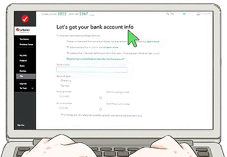 Choose how you want to receive your refund. If you've overpaid your taxes over the course of the year, you are entitled to a refund of the amount you overpaid. While you can choose to have the IRS mail you a check, you can also have the refund direct-deposited into your checking or savings account. If you choose direct deposit, you will need to provide the routing number and account number for your bank account.Tip: Even though you can file your return for free, TurboTax may charge a fee to process the direct deposit of your refund. This amount would be taken out of your total refund.