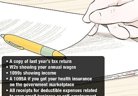 Gather the documents you'll need to file your taxes. Before you get ready to do your taxes, go ahead and get all the documents you have that are related to your income, payments, and any deductions you might be able to take. Keep those documents handy so you can provide the information to TurboTax when asked. Some documents you might need include: A copy of last year's tax return W2s showing your annual wages 1099s showing self-employment income, dividend income, or interest income A 1095A if you got your health insurance on the government marketplace All receipts for deductible expenses related to your small business or self-employment