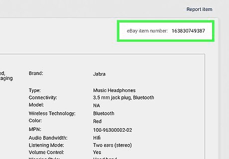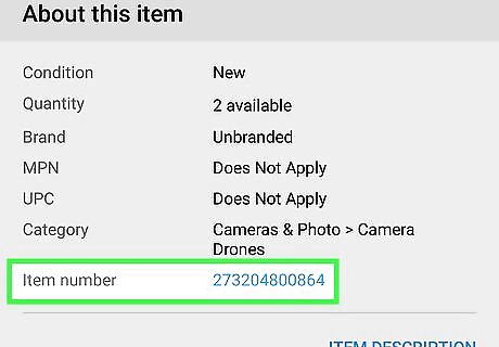 Look to the right of the Description tab. You'll see the "eBay item number" to the right of the Description tab that you can find under the item's image. If the Shipping and payments tab is active, you won't see the item number, so you'll need to click the Description tab to activate it. If you purchased the item, the "eBay item number" is included in the email sent to you to confirm the purchase. If you purchased the item, you can also find the "eBay item number" in the product listing in "Purchase History."