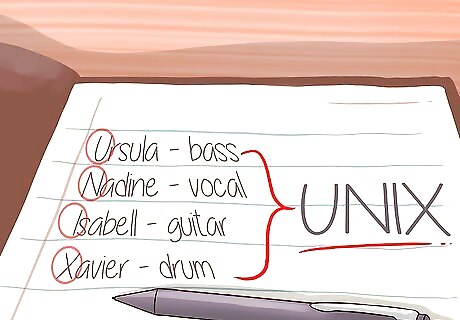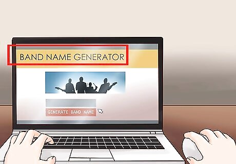 Pick a random name. There are different ways you can pick random names. Sometimes bands will randomly flip through a dictionary. That's what REM, The Pixies, Incubus, The Grateful Dead, Evanescence and Outkast did. Apoptygma Berzerk did as well, using two randomly found words. Use a band name generator. Some online sites will put together random words to generate lists of potential band names for you. The downside of a name generator is that you’re not tapping into your own creativity. And your band name won’t be something with meaning. Still, random names can generate inspired pairings. A randomly creative name might be more unique. Some of the best band names consist of putting two words together that have nothing to do with each other. Think: Pearl Jam. You can also just brainstorm random words that you think sound cool. And then put them together. Or put them together to create a new word (like Nickelback).