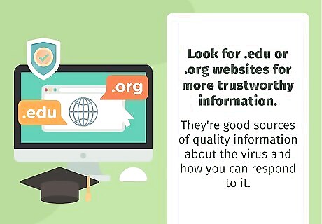 Look for .edu or .org websites for more trustworthy information. These tags indicate either schools or professional societies, both of which are generally more trustworthy than .com sites. They're good sources of quality information about the virus and how you can respond to it. While most .edu websites are reliable, .org websites sometimes aren’t. Not all organizations have the best information available. Compare the information on these sites with other sites that you know are reputable. A .org is best if it represents a health organization or hospital. For example, mayoclinic.org represents the Mayo Clinic in Minnesota and hopkinsmedicine.org represents the Johns Hopkins Medical Center.