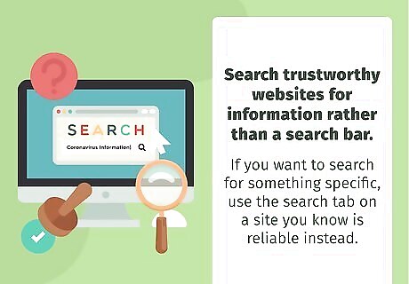 Search trustworthy websites for information rather than a search bar. A general internet search bar like Google doesn’t always present the best information. Instead, they usually show you the pages that rank highest without assessing if the information is accurate. If you want to search for something specific, use the search tab on a site you know is reliable instead. For example, if you want to know the best ways to protect yourself from the virus, go right to the CDC or WHO website and search there. Starting on Yahoo or Google might lead to some inaccurate claims, like the one that oregano helps kill the virus. If you do come across information on Google or another search engine, verify it on a reputable site. If you can't verify information with a reliable source, then don't believe it.