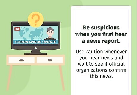 Be suspicious when you first hear a news report. News cycles move fast, and different networks might be in competition with each other to release a story first. This sometimes leads to fact-checking mistakes. Use caution whenever you hear news and wait to see if official organizations confirm this news. For example, if NBC reports that the coronavirus can infect cats, wait a little while to see if any other networks report on this or if the CDC releases a statement. If not, then this news was probably inaccurate. Did You Know? Mainstream news sources usually work hard to make sure they release accurate information, because their reputation would be harmed if they spread myths. But mistakes can happen, especially if they're trying to rush to get the story out. Mainstream news sources are usually but not always correct.