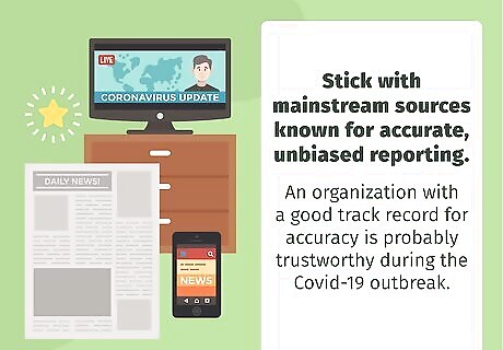 Stick with mainstream sources known for accurate, unbiased reporting. Like most people, you might not have time to research everything you hear in the news. In this case, try to get your everyday news from outlets known for accuracy and unbiased reporting. An organization with a good track record for accuracy is probably trustworthy during the covid-19 outbreak. Some organizations that consistently earn high marks for accuracy are Reuters, Wall Street Journal, New York Times, NPR, Bloomberg, and the BBC. Weekly or monthly publications that have good reputations are Foreign Affairs, The Atlantic, and The New Yorker. These news sources also have strong social media presences. Try following them all to get information from many different angles.