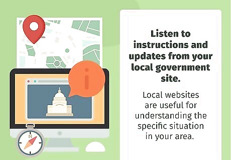 Listen to instructions and updates from your local government site. Besides national governments, state and local governments also maintain information pages about COVID-19. These pages usually present updates about measures your town or city is taking to contain the virus, so they’re useful for learning how your daily life might be impacted. Follow any specific instructions or precautions that your local government gives you to protect public health. In the US, sites that end in .gov are run and maintained by the government. These usually have the most reliable information. Try looking up the Department of Public Health for the county where you live. Local websites are useful for understanding the specific situation in your area. Your hometown may not be very affected by the virus, for example.