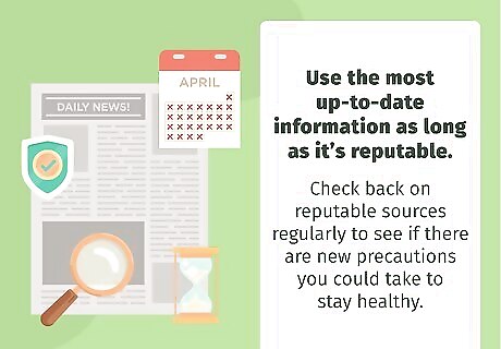 Use the most up-to-date information as long as it’s reputable. The coronavirus situation changes constantly, so news that’s only a few days old could already be outdated. Check back on reputable sources regularly to see if there are new precautions you could take to stay healthy. Remember that news organizations like to get information out quickly, so they might make fact-checking mistakes in the process. Only use the most current information available from reputable sources like government sites or health organizations.