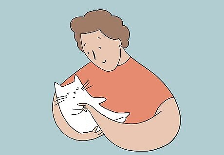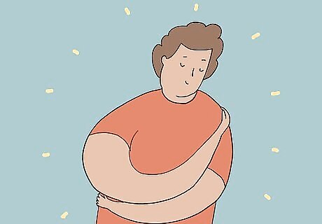 Try soothing self-touch. Humans require affectionate touch to thrive. Positive touch releases oxytocin, a powerful hormone that boosts your mood, relieves stress, and makes you feel bonded to others. Techniques that can help you relax in an emotional moment include: Placing your hand over your heart. Feel your heart beating, the rising and falling of your chest, and the warmth of your skin. Repeat some positive words to yourself, such as “I am worthy of love” or “I am good.” Giving yourself a hug. Cross your arms over your chest and place your hands on your upper arms, squeezing yourself securely. Repeat a positive phrase, such as “I love myself.” Cup your face with your hands, like you would for a child or a loved one, and stroke your face with your fingers. Repeat a few words of kindness to yourself, such as “I am beautiful. I am kind.”