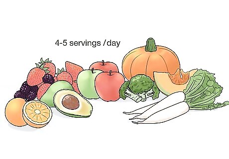 Eat 4-5 servings each of fruits and vegetables each day. Having a variety of fruits and vegetables in your diet is an important part of eating healthily and looking after your heart. They are rich in vitamins, minerals, and dietary fiber, while being low in calories. Aim to eat a rainbow of fruits and vegetables each day to get a variety of heart-healthy nutrients. 1 serving of fruit is approximately 1 medium-sized whole fruit, ¼ cup (about 50 g) of dried fruit, ½ cup (about 60 g) of fresh, frozen, or canned fruit, or 6 fluid ounces (180 mL) of fruit juice. 1 serving of vegetables is 1 cup (about 30 g) of raw, leafy greens, ½ cup (about 80 g) of cooked vegetables, or 6 fluid ounces (180 mL) of vegetable juice. Choose fresh or frozen vegetables rather than canned vegetables. The canned ones tend be have added salt. If you do get canned vegetables, make sure they are marked as low-sodium or low-salt. Likewise, avoid canned or frozen fruit with added sugar or syrup. If you eat dried fruit, check the ingredients to make sure it’s free of sulfites and added sugar, and limit yourself to smaller servings—e.g., 2 dried apricots or 2 tablespoons (29.6 ml) (16 g) of dried cranberries. Try to limit the amount of fried or breaded vegetables you eat, since the frying and breading processes tend to add extra fat and empty calories.