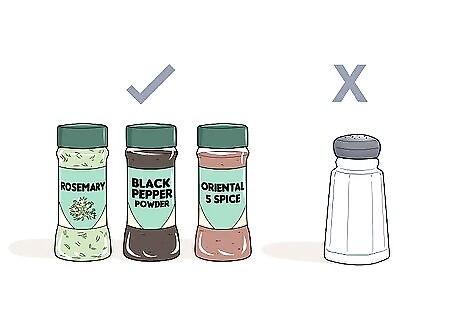 Lower your salt intake. One of the ways you can help prevent and control high blood pressure is by lowering the amount of salt and sodium you consume. Aim to consume no more than around a teaspoon (5.69 g) of salt throughout the day (about 2,300 mg of sodium). It is even better if you can get yourself down to two thirds of a teaspoon (4.27 g) of salt (1,500 mg of sodium). There are a number of steps you can take to lower your salt consumption: Use products that have no added salt or are reduced-sodium. Flavor your food with herbs and spices rather than salt. Eat fresh meat and poultry rather than canned or prepared meat, which will generally have high a salt content. If you do eat canned fish or vegetables, rinse it under the tap before you eat it. Get into the habit of reading the nutritional information on food packaging and choosing food that has lower amounts of salt or sodium.
