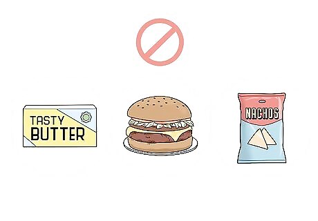 Cut down on saturated fats. If you consume a lot of saturated fats, you can raise the level of cholesterol in your blood, which can lead to heart disease. Avoid eating too many foods that are high in saturated fats to help keep your heart healthy and reduce the chances of you suffering from heart disease. These include foods such as fatty meats, butter and margarine, greasy fast food, and fatty snacks such as packaged cookies, crackers, and chips. Make changes to your diet by choosing leaner cuts of meat and 1% fat milk. You can also improve your diet by including healthy sources of fat, such as vegetable oils, seeds and nuts, olives, avocadoes, and fatty fish (like salmon, mackerel, and tuna). The average person consuming around 2,000 calories a day should not have more than 20 g of saturated fat each day. Check food labels for information on the amount of saturated fat you are consuming. If you have high blood pressure or heart disease, the amount of saturated fat you should consume will be different. Consult your doctor for advice.