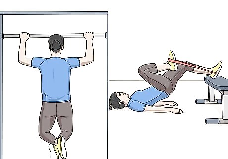 Incorporate strength training into your daily routine. Strength training is another key component of losing weight in a healthy way. To help yourself build muscle and lose fat at the same time, aim to work out each of your major muscle groups at least twice a week. Do a single set of 12-15 reps of each exercise. Strength training exercises involve using resistance to build your muscles. This can include things like lifting weights, using resistance bands, or creating resistance with your own body weight (for example, doing planks or pullups). If you’re not used to doing strength training, start simple by lifting objects around your home a few times a day (such as a heavy book or a milk jug). As that becomes easier for you, move on to heavier items. Ask your doctor about how to do strength training safely if you already have a heart condition or other health problems.