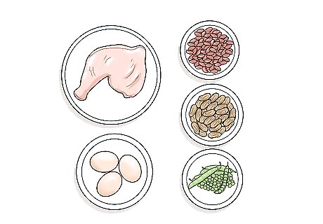 Choose lean sources of protein. Lean proteins help you build muscle and maintain higher energy levels. Eat healthy, low-fat proteins each day, such as skinless poultry breast, fish, beans and peas, nuts and seeds, soy products, eggs, and low-fat dairy. Avoid getting your proteins from fatty meats, processed meats (like hot dogs or Spam), full-fat dairy products, or fried or breaded meats. These foods tend to be high in ingredients that are bad for your heart, like sodium and saturated fats.