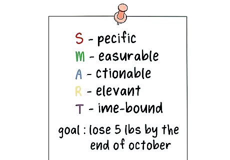 Set SMART goals for getting fit. It can be hard to stay motivated to exercise, especially if your goals feel too big to manage. Setting goals that are SMART (Specific, Measurable, Actionable, Relevant, and Time-bound) makes it more likely you will stick with your plan to get active and be heart-healthy. For this to work, your goals need to be more concrete than just "Get healthy" or "Have a healthy heart." Try setting a goal that is specific, timely, and achievable. For example, your goal might be "I want to lose 5 pounds (2.3 kg) by the end of October," or "I want to get my blood pressure down to 120/80 or lower by June." Write down your goals and revisit them to stay motivated. Once you achieve a goal, check it off your list, and don’t forget to congratulate yourself and celebrate! If a goal seems too overwhelming, try breaking it down into a series of mini-goals. For instance, if you’re working up to being able to run a half-marathon, you might start with a goal of jogging for 20 minutes a day, 3 days a week.