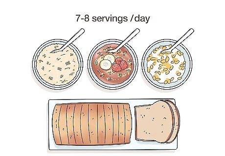 Get 7-8 servings of whole grains each day. Whole grains are a great source of dietary fiber, complex carbohydrates, and other heart-healthy nutrients. Eat plenty of whole grain foods, such as whole-grain bread, high-fiber cereals, oatmeal, brown rice, quinoa, barley, and whole-grain pasta. A single serving of whole grains is 1 slice of whole-grain bread, 1 cup (about 40 g) of whole-grain cold cereal, or ½ cup (about 100 g) of cooked whole-grain rice, pasta, or cereal. Avoid sources of refined grains, such as white bread and pasta, buttered popcorn, snack crackers, and baked goods made with white flour. These foods are high in calories and low in nutritional value.