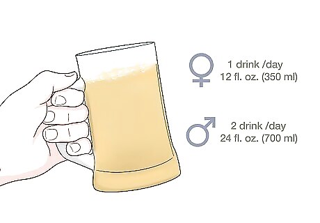 Drink alcohol only in moderation. If you drink alcohol, drinking in moderation should not cause problems for your heart health. Drinking a lot, however, will increase your risk of heart problems, including raised blood pressure and a heightened risk of suffering a stroke. If you’re concerned that you drink too much, talk to your doctor about how to cut back or quit. Don’t start drinking if you don’t currently drink.Keep in mind: There’s some evidence that people who drink red wine in moderation have a lower risk of heart disease, but it’s not clear that drinking will directly benefit your heart. The risks associated with drinking are higher than the possible benefits, so the American Heart Association recommends that you do not start drinking if you currently abstain. Moderate drinking is defined by the National Institute on Alcohol Abuse and Alcoholism as no more than 1 drink a day for women and 2 for men. One drink is equivalent to 12 fluid ounces (350 mL) of beer, 5 fluid ounces (150 mL) of wine, or 1.5 fluid ounces (44 mL) of liquor. Alcohol contributes to wide range of health problems, including increased risk of stroke, raised blood pressure and triglyceride levels, damage to the heart muscle, and addiction.