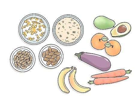 Incorporate fiber into your daily diet. Eating plenty of fiber can help lower your risk of heart disease. Doctors recommend eating 25 grams (0.88 oz) of fiber daily if you’re a woman and 38 grams (1.3 oz) daily if you’re a man (or 21 g for women and 30 g for men if you’re over 50). To get more fiber in your diet, eat plenty of whole grains, fruits and vegetables, and nuts and seeds. For example, regularly having a bowl of a bran cereal for breakfast will help you get enough fiber. Swap white bread for whole grain bread to up your fiber intake. Eating plenty of fiber will also help you lose weight or maintain a healthy weight by making you feel fuller and more satisfied while eating fewer calories.