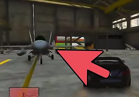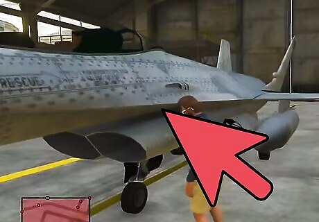 Get inside a jet. Once you spot a P-996 Lazer, found everywhere inside the base, press the Y button (for Xbox) or Triangle button (for PS3/4) to board the aircraft. Once you're inside, press the UP button to take off and fly away.