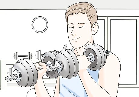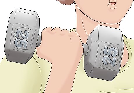 Add heavier weights and more reps gradually as your muscles get stronger. In future workouts, you can gradually build up by increasing the weight or doing more reps per set. Increase your weight in small increments and never increase the weight to a point where you can't lift with good form. For example, if you were previously lifting 20 pounds (9.1 kg) for 8 reps per set, you could either move on to 25 pounds (11 kg) or 10 reps per set. Building up your strength gradually will lead to more long term gains than exhausting yourself with heavy weights right away.