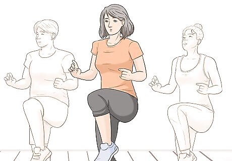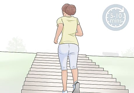 Warm up for 5-10 minutes before you start your workout. You can warm up by climbing stairs, jogging on the treadmill, using the elliptical, or even just going for a brisk walk before you start your workout. Warming up is super important – not only will it ease you into the workout, but it can prevent you from straining your muscles and getting injured later. Try mixing up warm-ups you do so that you don't get bored. One way to make warming up more fun is to listen to music or an audiobook while doing it.