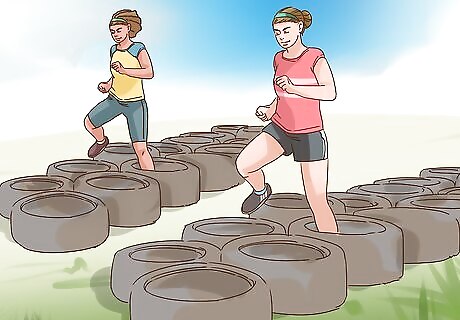 Create your own bootcamp. Like organizing and being in charge? Come up with your own exercise routine to do at home and get a group together to participate. Try a structure like: crunches, planks, squats, plyometrics, push-ups, and triceps dips off the edge of a chair. Create a circuit by assigning a number of "reps" to each activity (e.g. 20 crunches) before moving on. Go through the whole circuit maybe twice when you start, and you can gradually increase how many times you go through the whole routine as your fitness improves. You can also try getting really original and making your own obstacle course. Use old tires, jump ropes, chairs – anything that can turn into something you can climb over, jump over, dodge, or workout with. Challenge each other to races through the course.