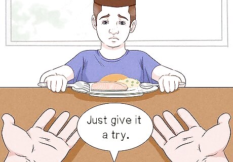 Be persistent, but not pushy. It can take between 10 and 15 exposures to a new, healthy food for a child to try something, so take you time and avoid yelling or forcing a child to eat. This will only give them bad memories of the food and make it harder to get them to try something else later. Put the food in front of them and ask them to give it a try, but don't get upset if they won't finish it. Thank them for trying and move on to another food. Try different ways of cooking foods, such as raw vegetables one night, steamed the next, and roasted the third. Let them know that cooking changes taste and texture. Avoid micromanaging your child's diet. This can often backfire and cause issues with food and eating later on in life.