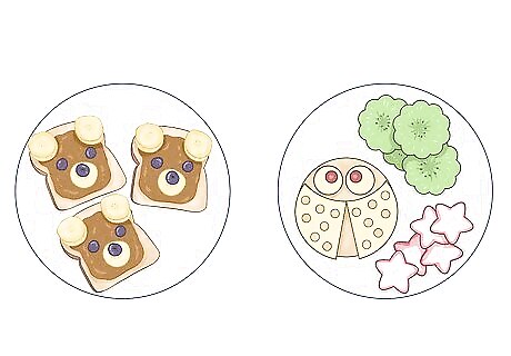 Make eating the food fun. Smiley faces, even when they are made out of peas, look a lot more appetizing than a pile of green, slimy orbs. Use the occasional drop of food coloring to make "Green eggs and ham" or blue spaghetti squash. While you don't need to go overboard, healthy food is a lot easier to get on the table if it is hidden behind something fun. Let them know fun or exotic names of things, like Papaya, Mango, Zucchini, or Bok Choi. Cut up vegetables into fun shapes. Have kids sample the food for a "texture test" before you put it on the table. Let your children explore a bit -- ask them how they might cook something or show them where the food comes from.