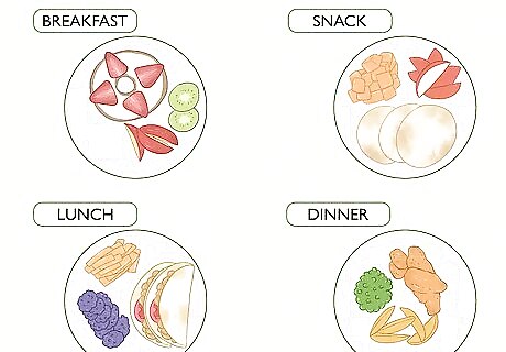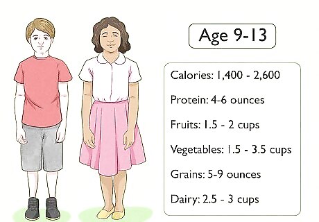 Know the nutritional needs of children. Depending on their age, different children will need different amounts of food. The following rough guidelines are for young children age 9-13, provided by the Mayo Clinic. Girls are on the lower end while boys are generally on the higher end of the estimates: Calories: 1,400 - 2,600 Protein: 4-6 ounces Fruits: 1.5 - 2 cups Vegetables: 1.5 - 3.5 cups Grains: 5-9 ounces Dairy: 2.5 - 3 cups These are estimates meant to help you gauge relative amounts of food. While you don't have to measure out each ounce, you do want roughly 50% more grain than protein, for example.